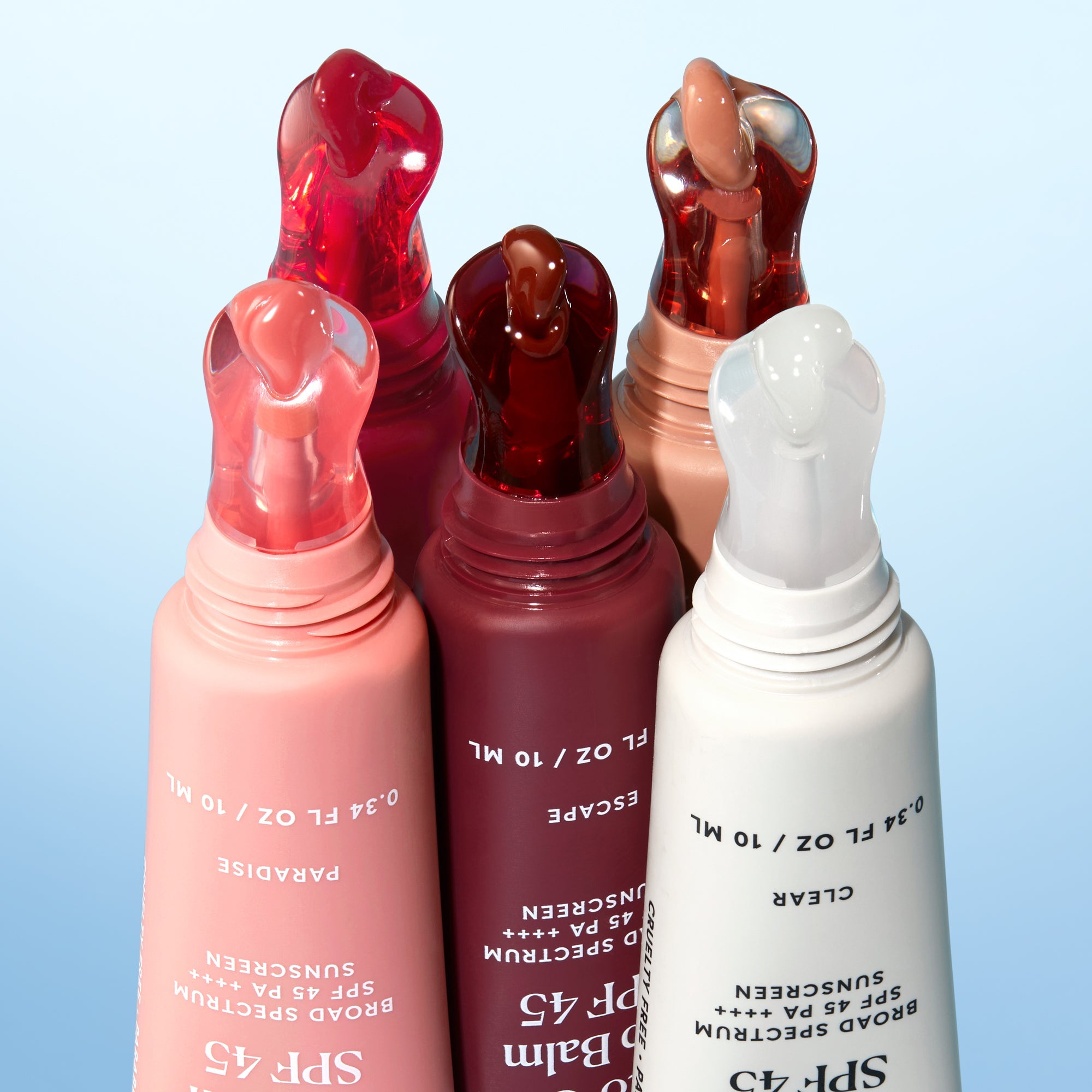 Clear (clear), Paradise (coral pink), Getaway (muted rosy nude), Escape (warm mulberry) and Oasis (red velvet).